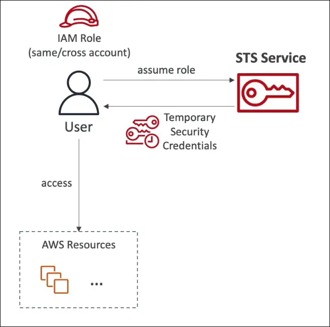 AssumeRole). - STS returns temporary credentials (access key, secret key, session token).