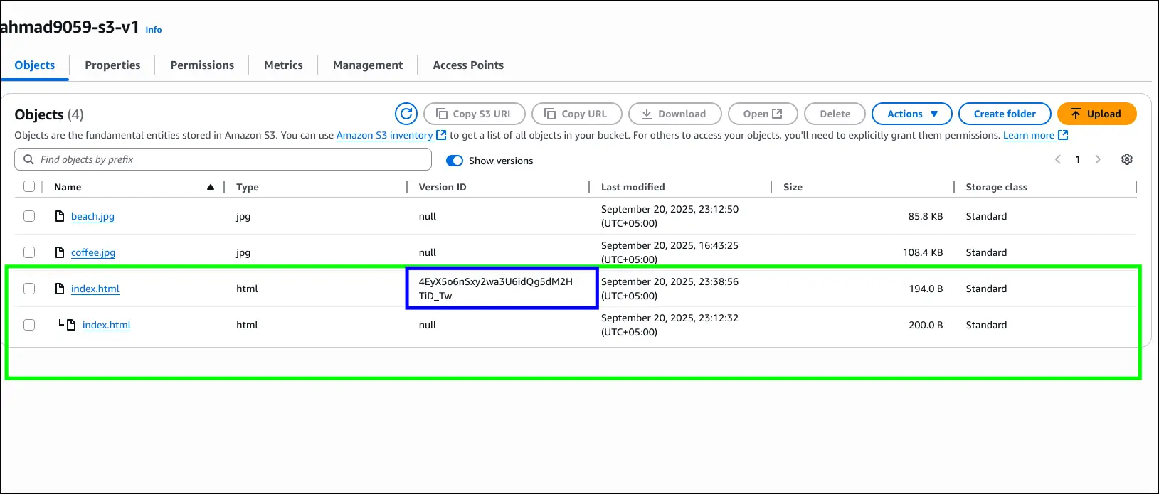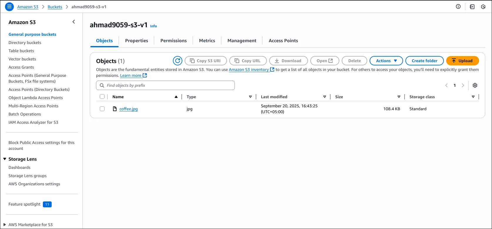 coffee.jpgexample). - The file is now visible under Objects in the bucket.