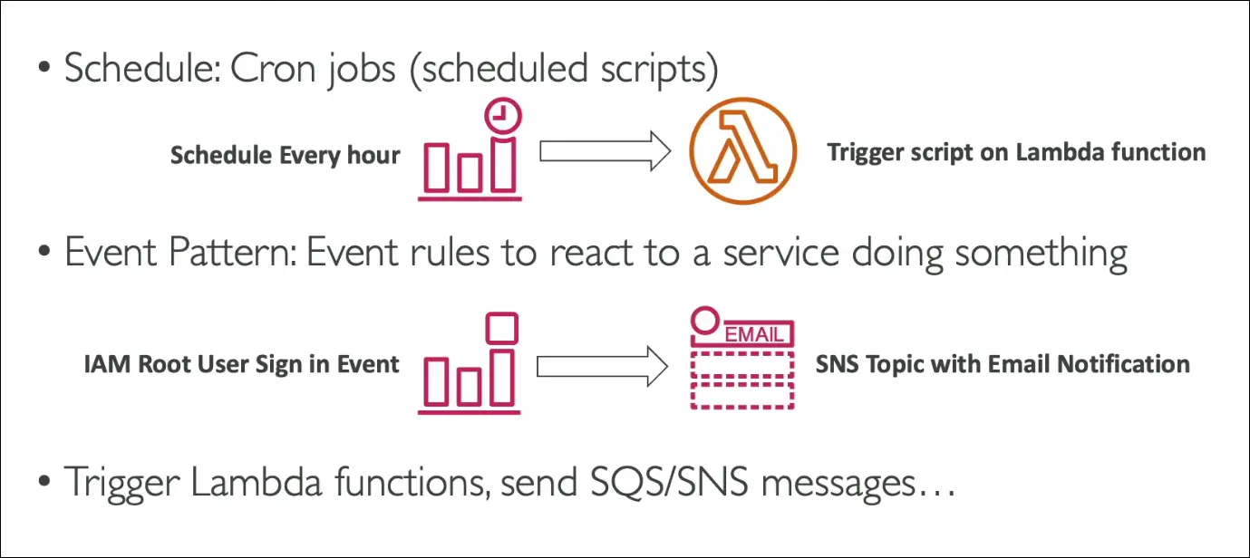 - Automated reactions: Respond to AWS events (e.g., root user sign-in, EC2 state change).