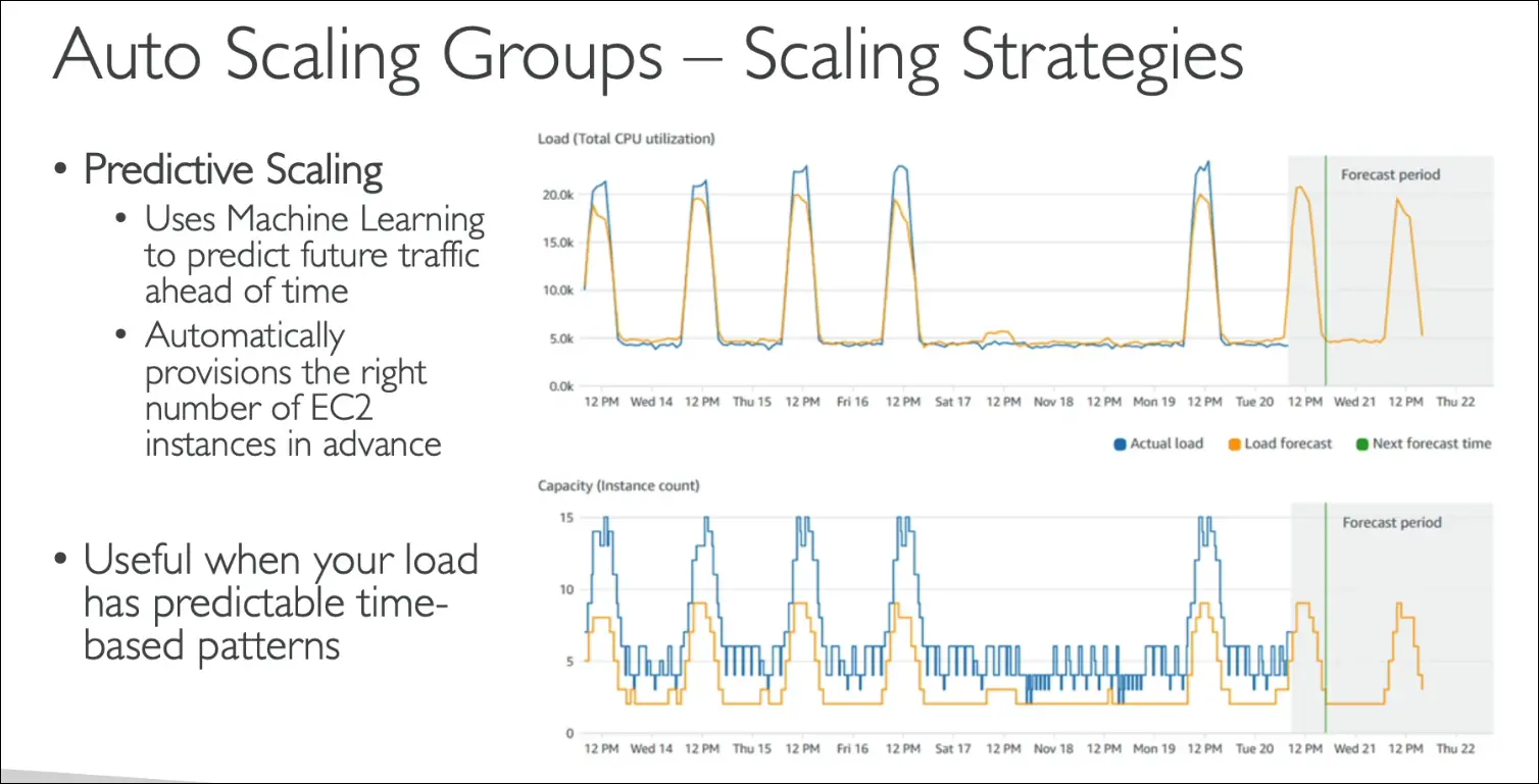 - Predictive Scaling = ML-based traffic forecasting.
