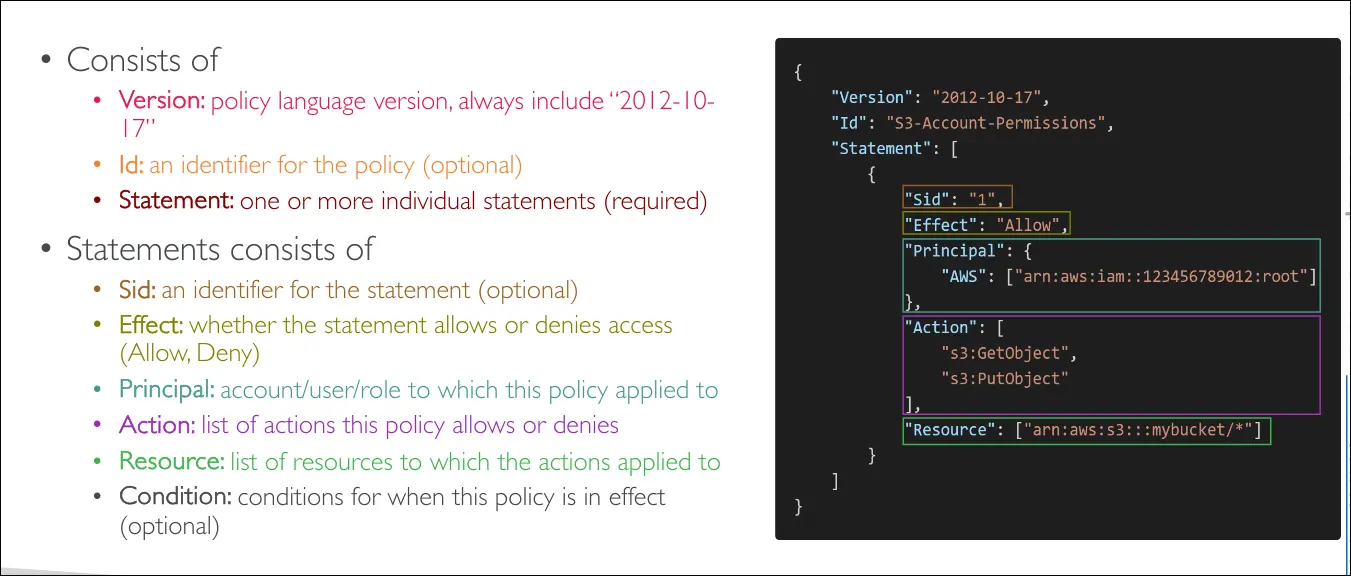 IAM policies are written in JSON and have these main parts: