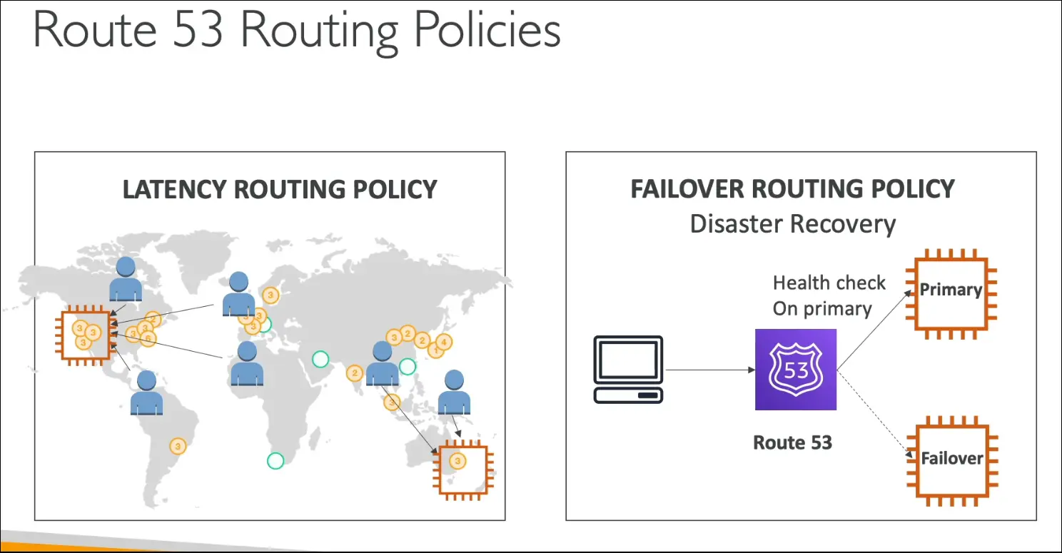 - Supports routing policies like latency-based, geolocation, failover, etc.