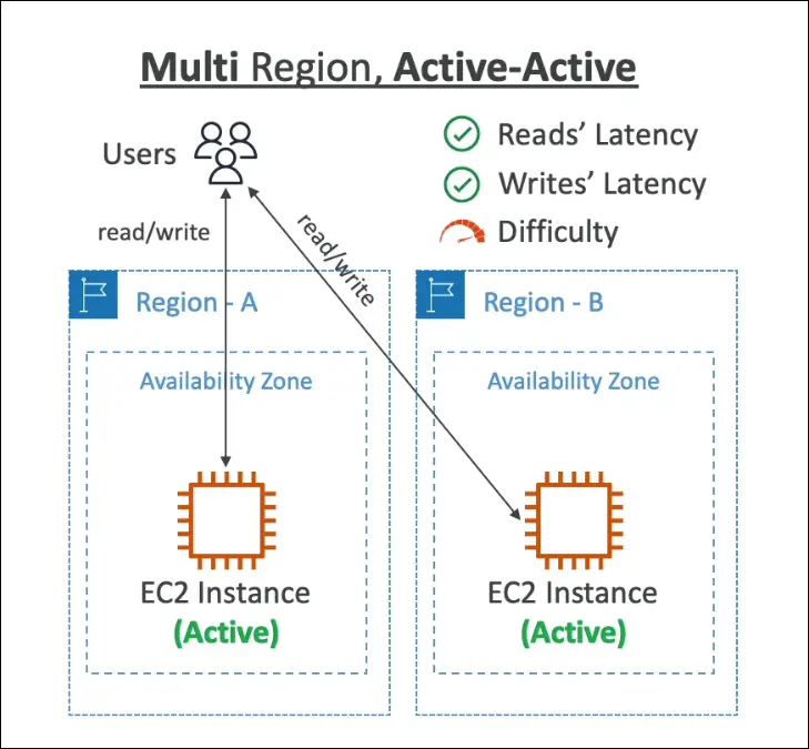 | Example | DynamoDB Global Tables, Route 53 latency-based routing, global web apps |