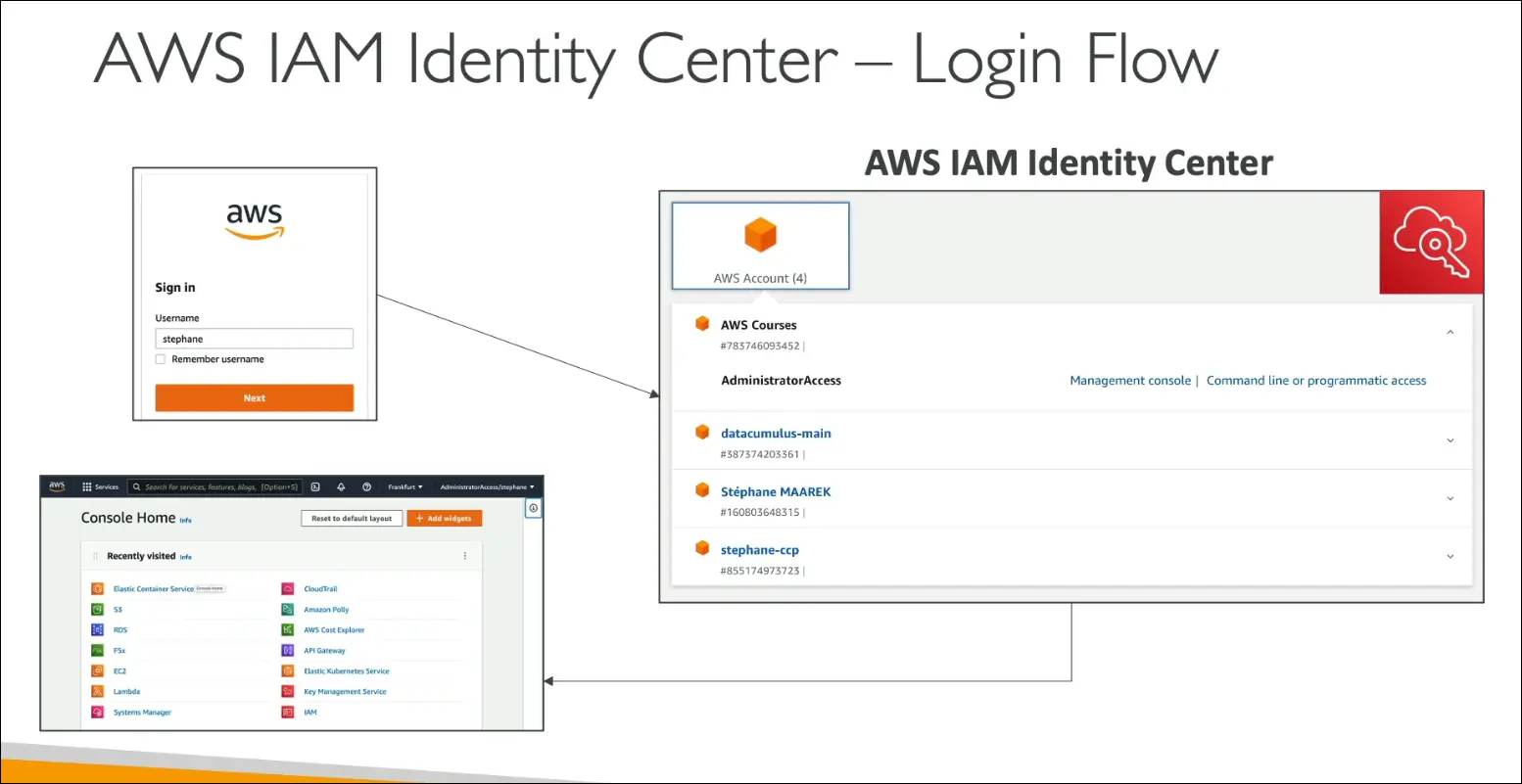 - If you see “one login for multiple AWS accounts” or “single access point for all AWS accounts or applications”, the correct answer is IAM Identity Center.