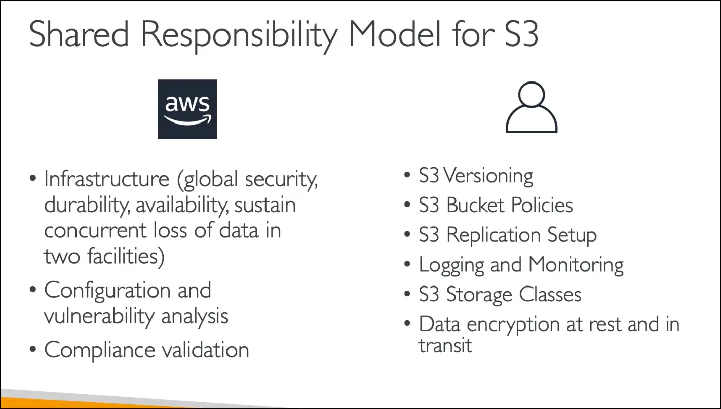 Exam tip: AWS secures the infrastructure of S3, while the customer secures data in S3 (access controls, policies, encryption, monitoring, and cost management).