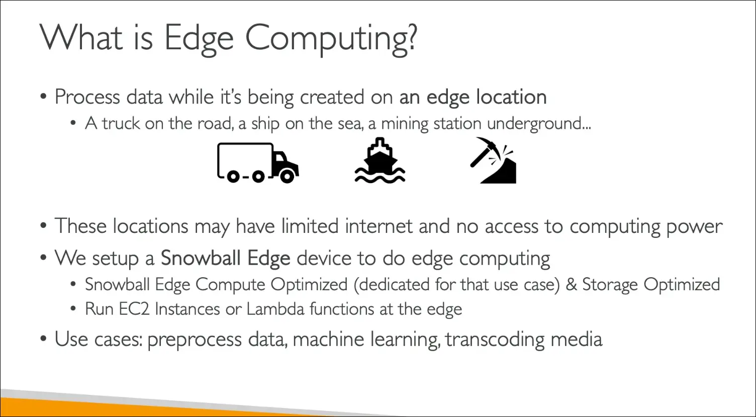 - Snowball Compute Optimized → Edge computing + EC2/Lambda at the edge.