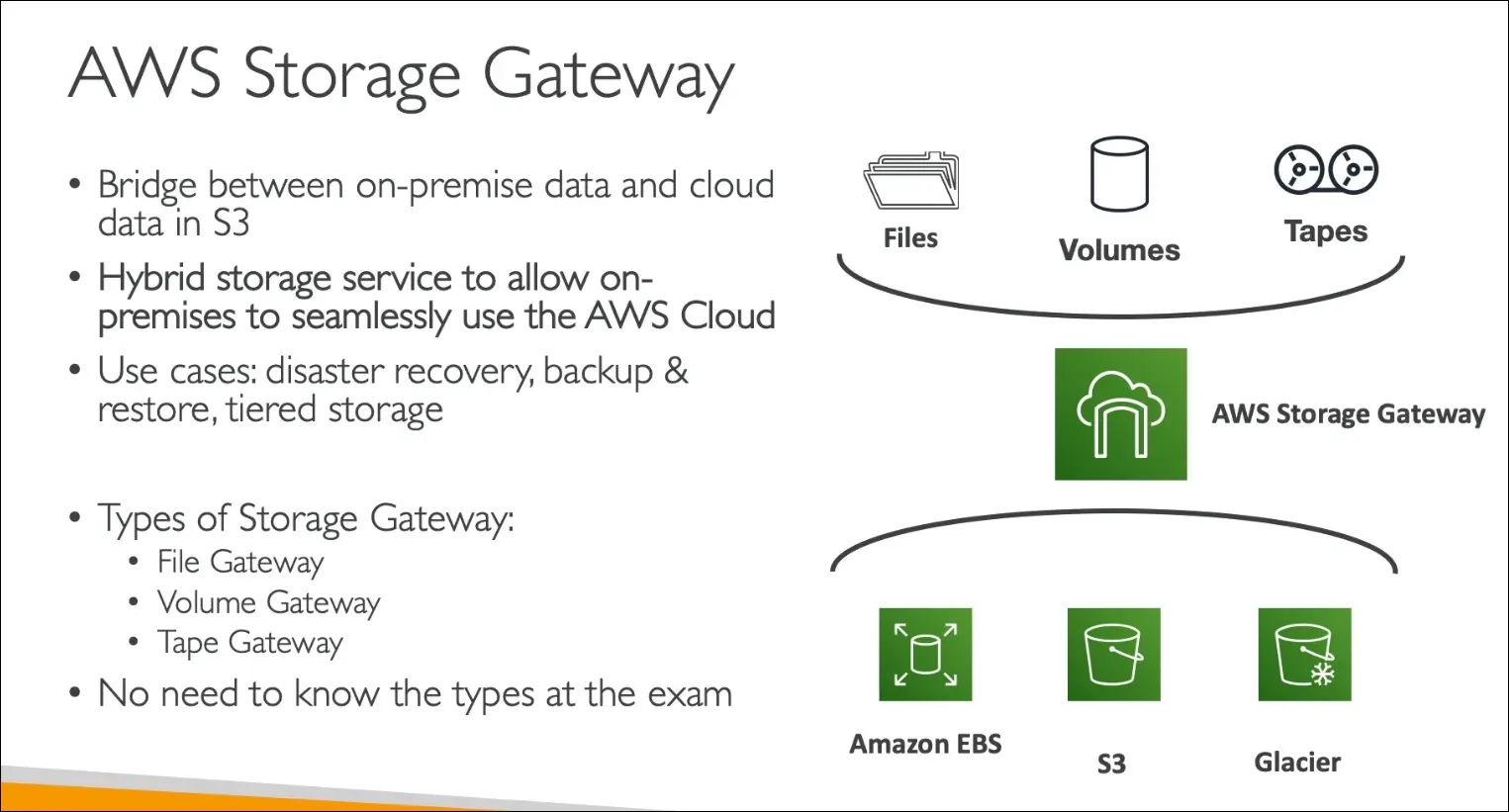 - Storage Gateway bridges on-premises storage with AWS cloud storage.