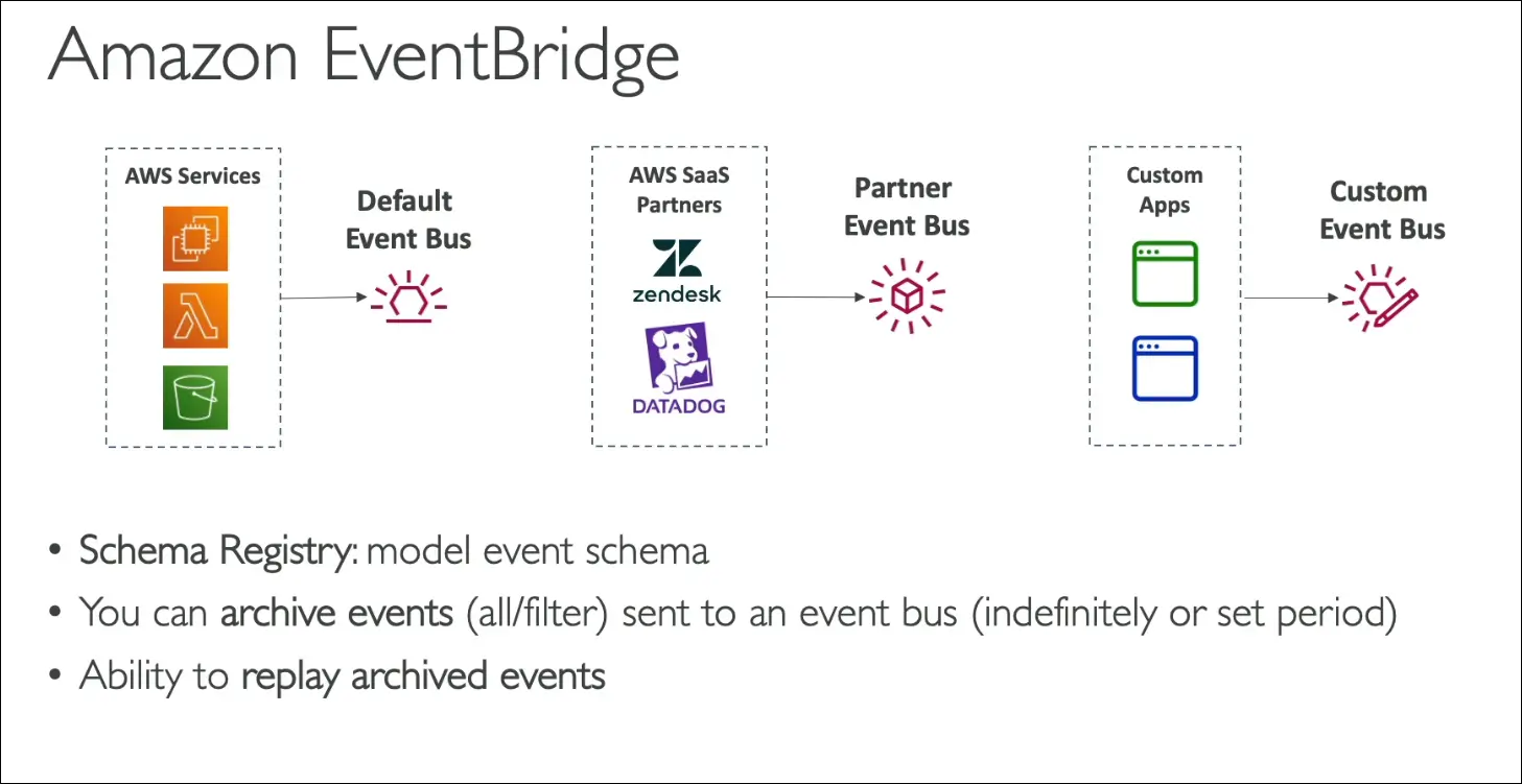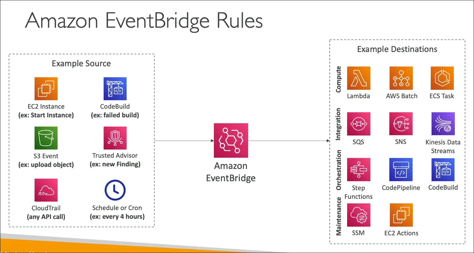 | EventBridge (CloudWatch Events) | React to events or schedules | Trigger Lambda on EC2 state change |