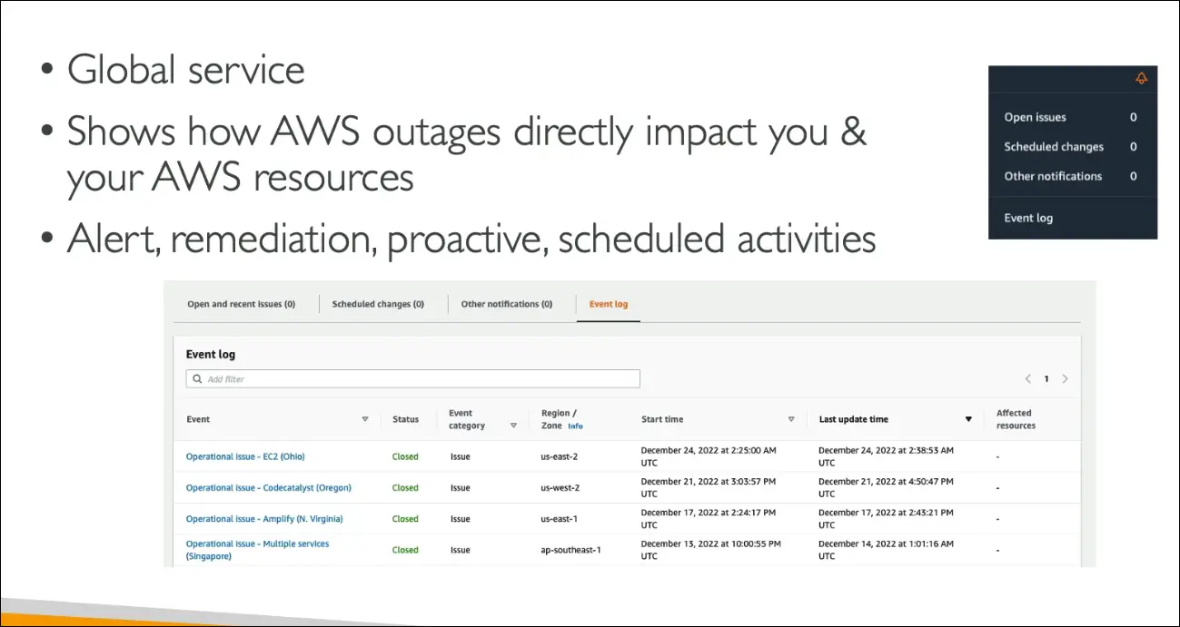 | Account Health Dashboard | Your AWS account (private) | Personalized alerts & guidance | See EC2 issue affecting your account |
