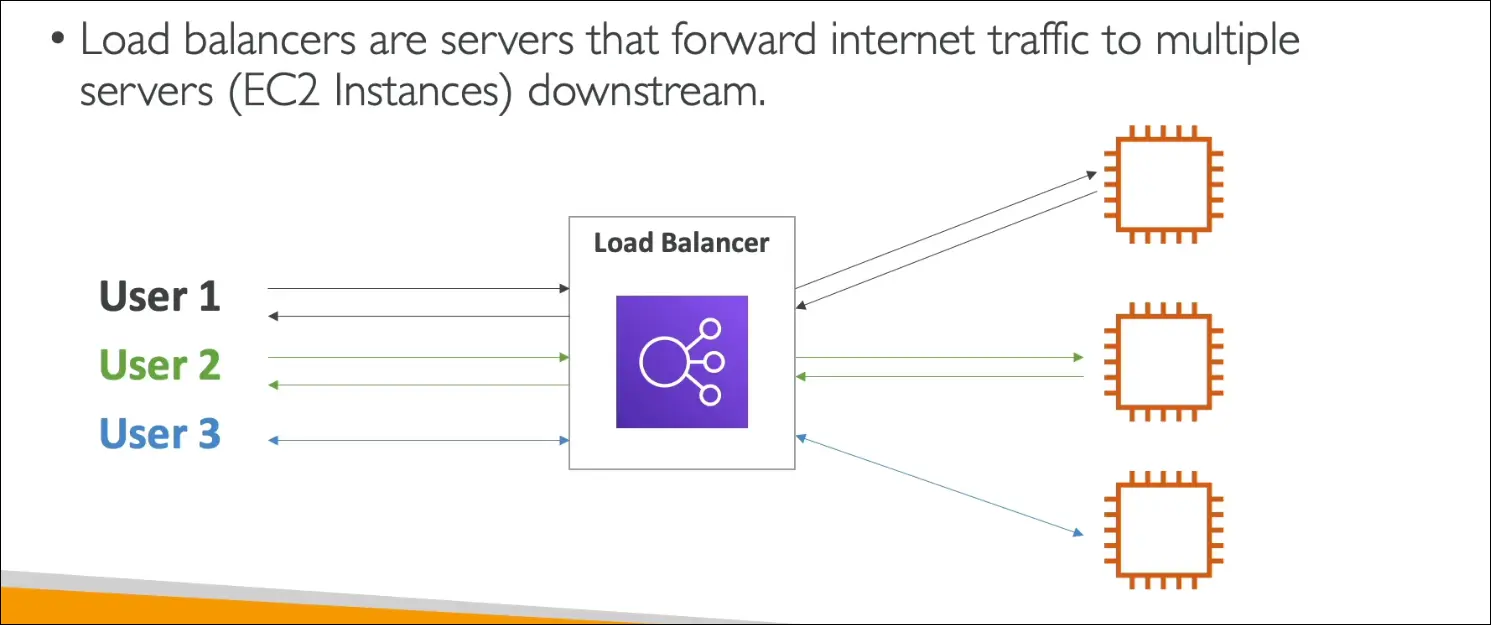 - A Load Balancer is a server that distributes incoming internet traffic across multiple backend servers (EC2 instances).
