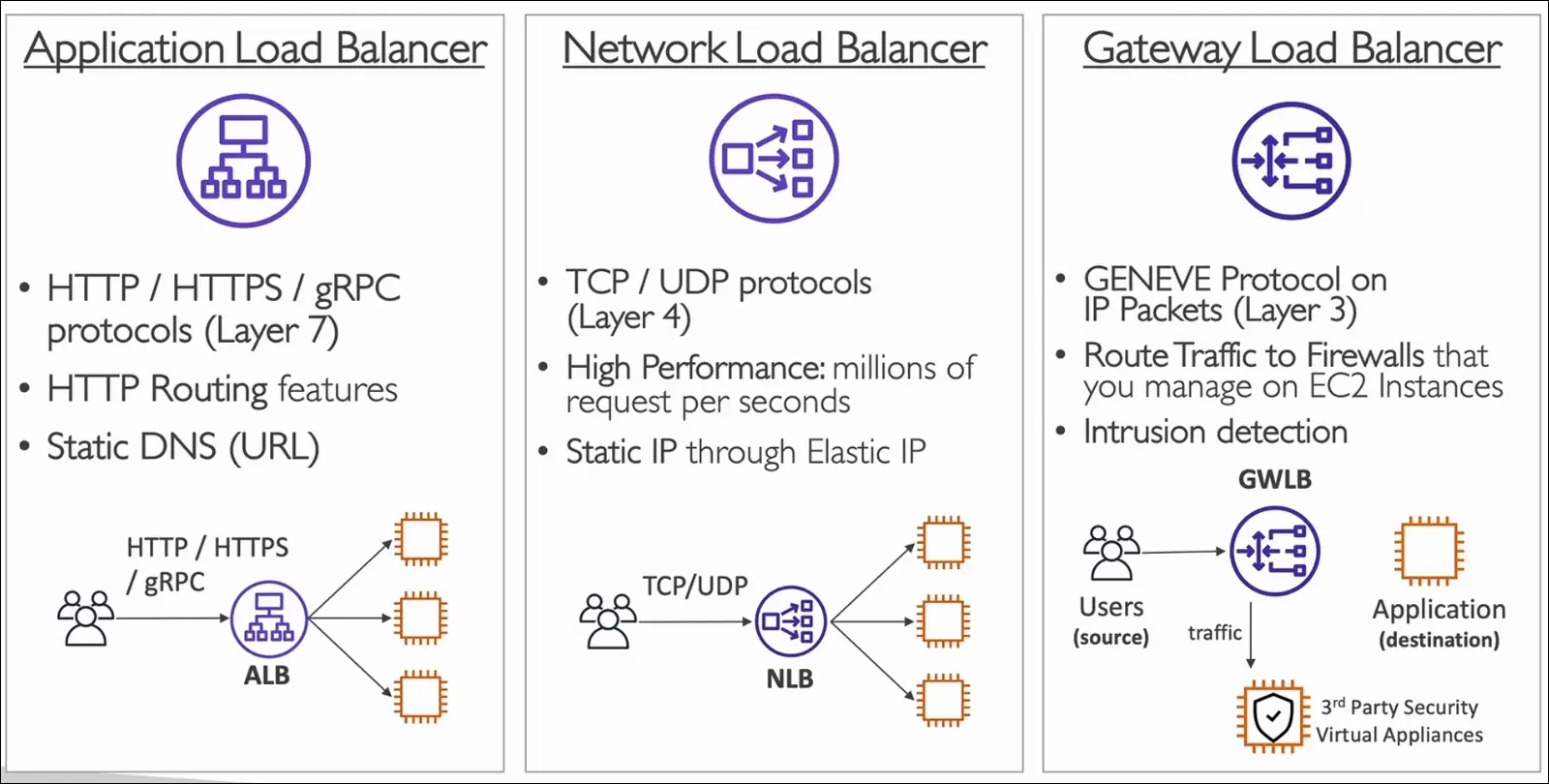 - NLB → Layer 4, TCP/UDP, high performance, static IP.