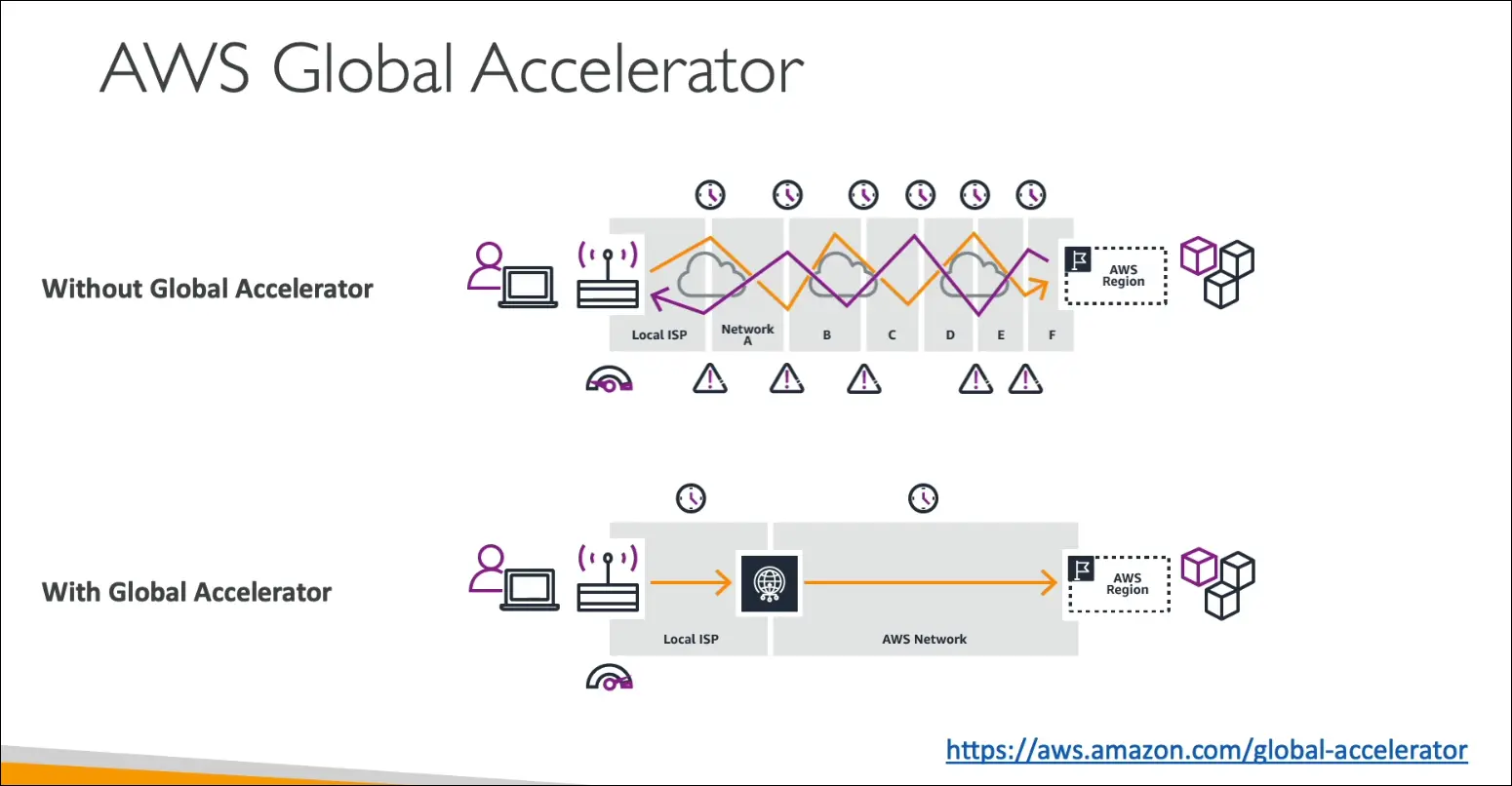 | Global Accelerator | Improves app performance | Routes via AWS global network backbone |