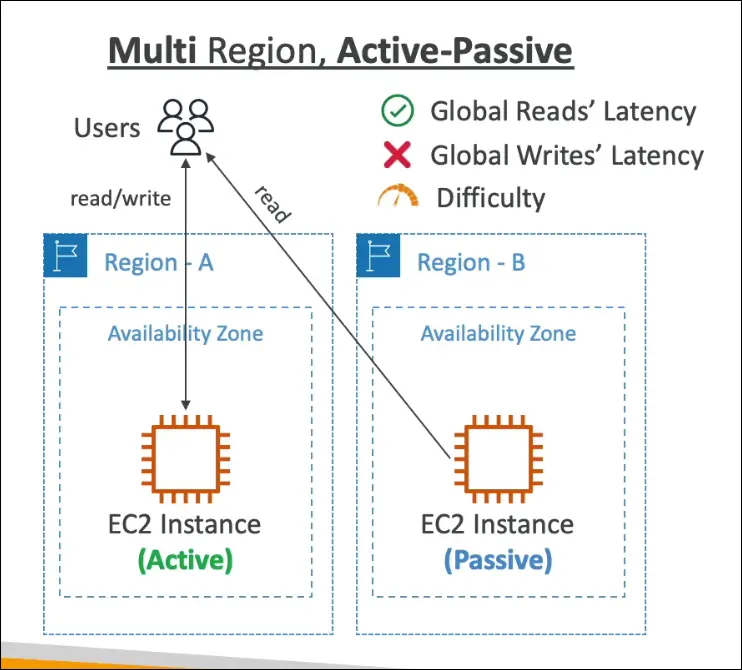 | Example | DynamoDB Global Tables, Route 53 latency-based routing, global web apps |